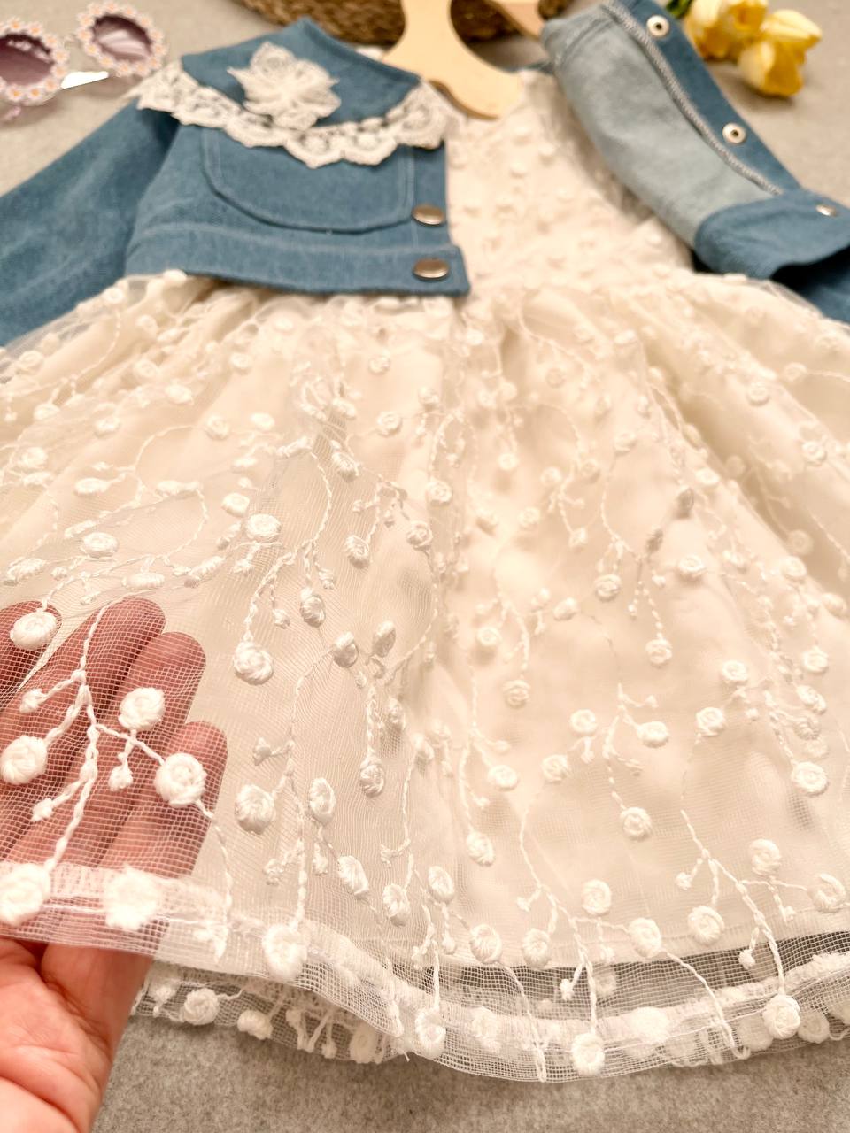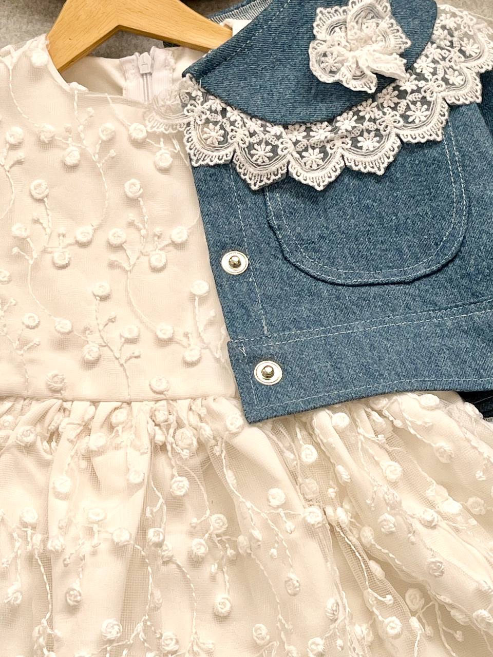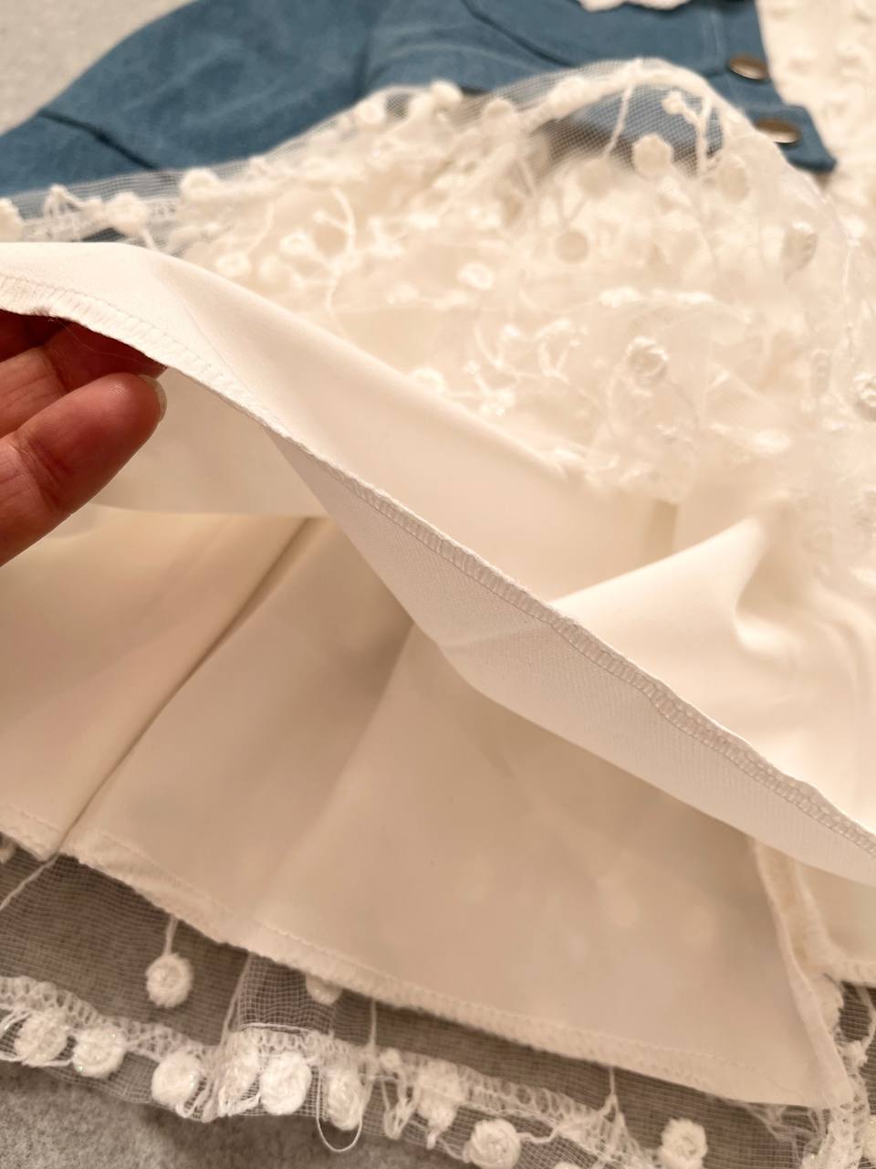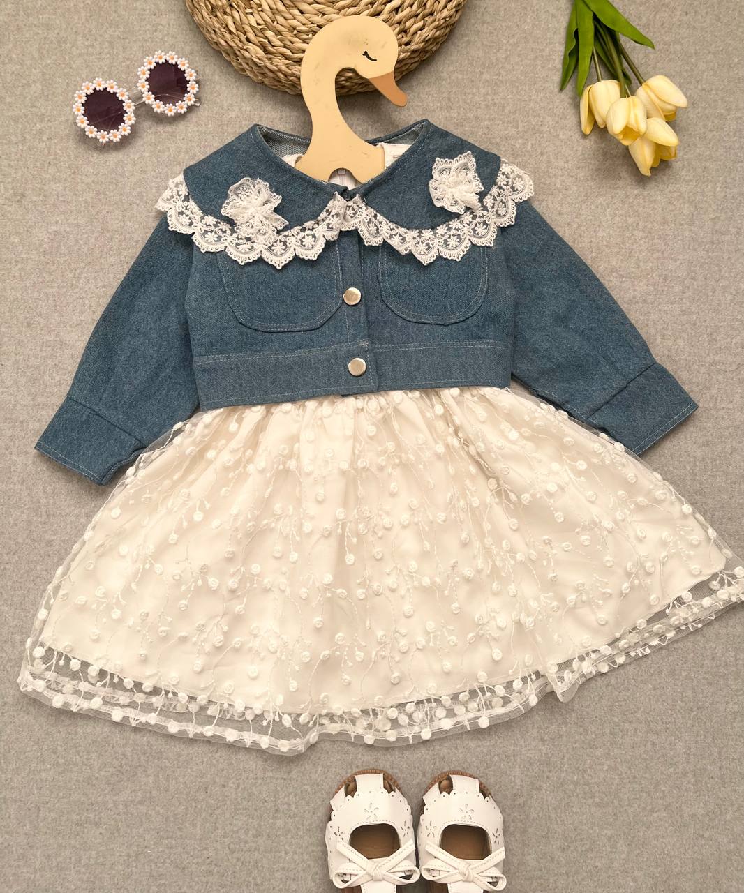 جنس کت جین شستشو شده جنس سارافون تور خامه دوزی گل برجسته سارافون کامل استر کشی شده پشتش زیپ مخفی با کمر بند هم تنظیم میشه